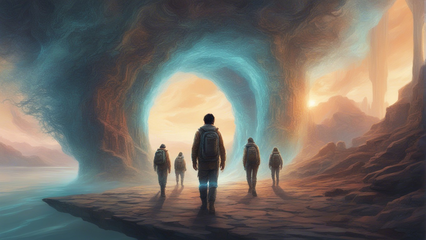 In this mesmerizing digital painting, a brave group of explorers steps through a shimmering portal, embarking on an interdimensional journey that transcends the boundaries of reality itself. They find themselves amidst surreal and otherworldly landscapes, where the laws of physics and nature defy comprehension. Each explorer wears an expression of awe and wonder, their faces illuminated by the ethereal glow of the portals.